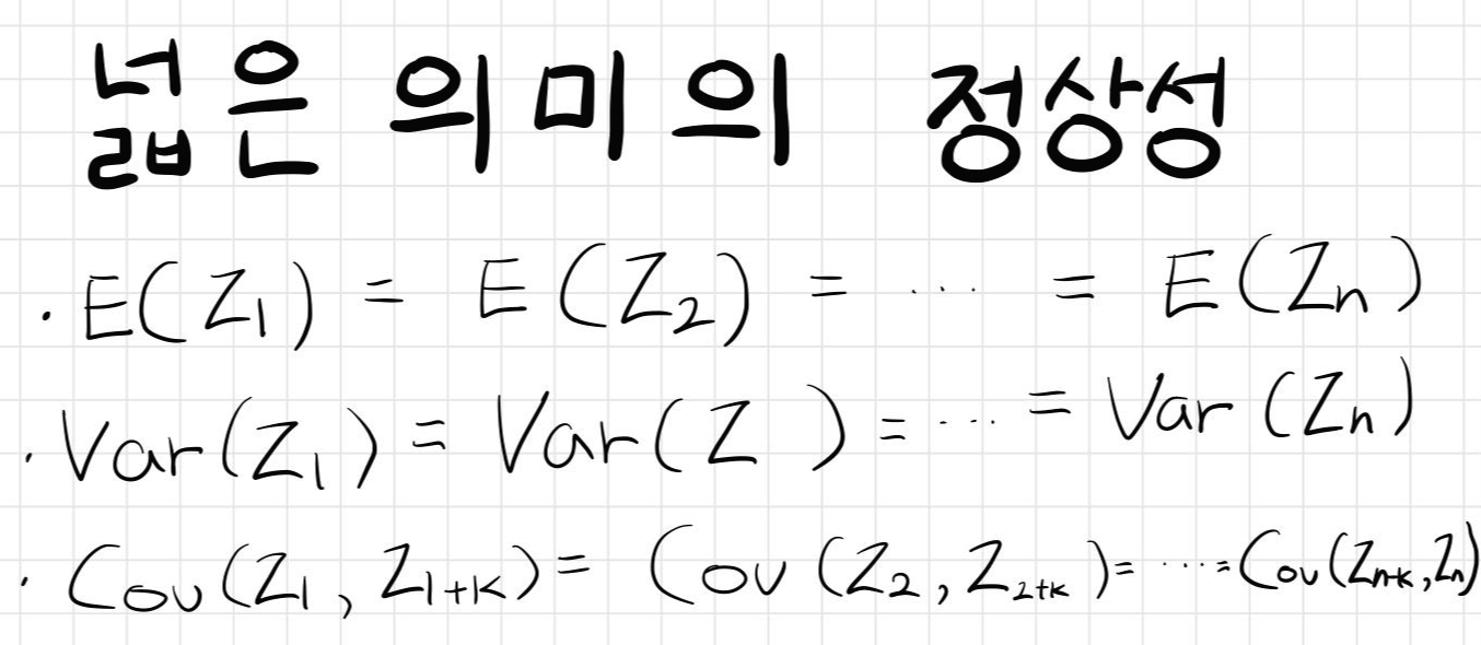 - 즉, 시계열의 평균과 분산이 시점 t에 관계없이 일정하고 공분산은 두 시점의 시차 k에만 영향을 받음