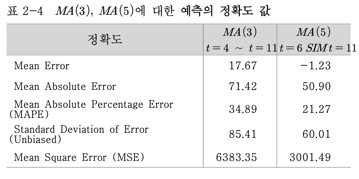 => 주기가 큰 MA(5)가 MA(3)보다는 부드러운 예측값들의 곡선을 나타내고 있음을 볼 수 있고, 두 가지 예측방법의 여러 가지 정확도 값들을 비교해볼 때, 모든 척도 값에서 MA(5)가 MA(3) 보다는 척도가 작기 때문에 좋은 예측방법이라고 볼 수 있다.