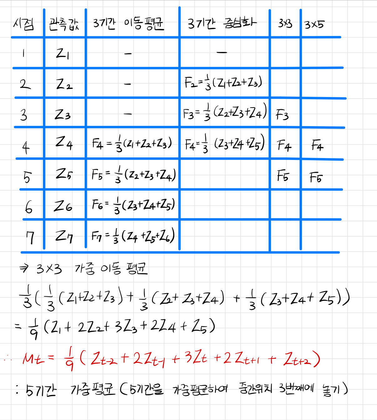 1) 3x3 이중이동평균(3x3 가중이동평균) : 3기간 중심화 이동평균을 다시 3기간 중심화 이동평균한 것