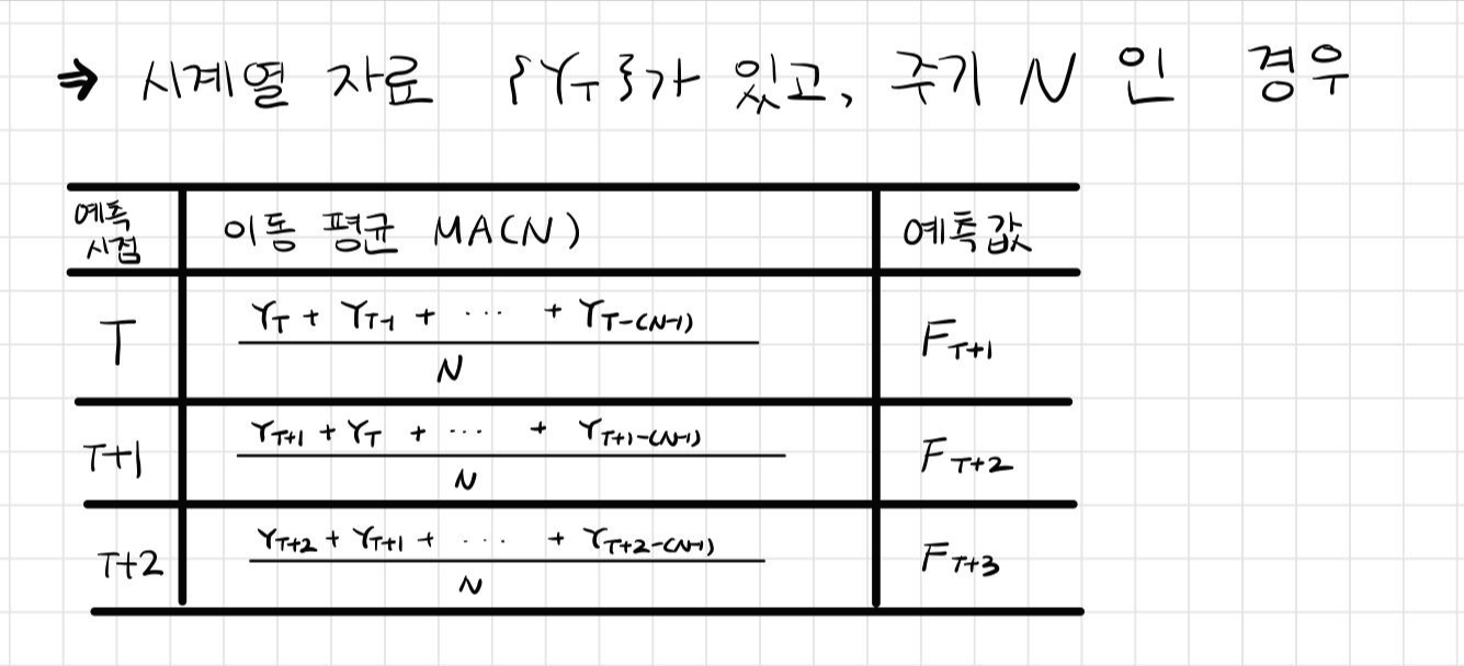 3) 예측시점을 기준으로 과거 일정한 개수의 자료들 평균을 다음 시점의 예측값으로 사용하는 방법이다.