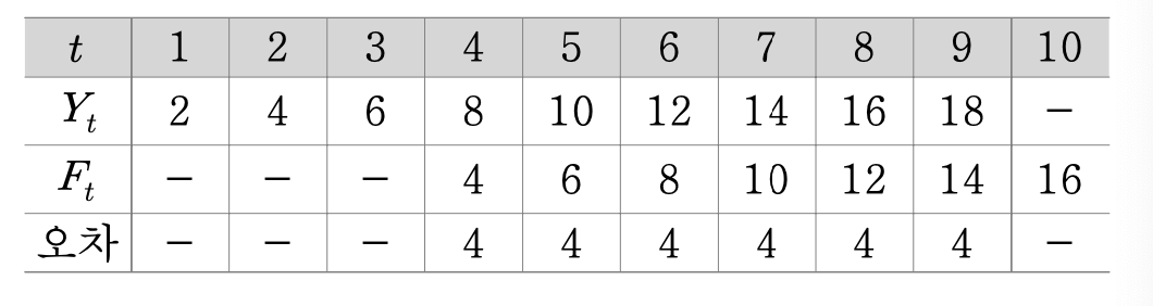 => 시점이 2만큼 증가하는 추세가 있는 경우 시계열자료 주기 3의 단순이동평균방법을 적용시켜 예측할 경우 오차가 동일하게 4가 나오고 이는 체계적 오차에 해당된다.