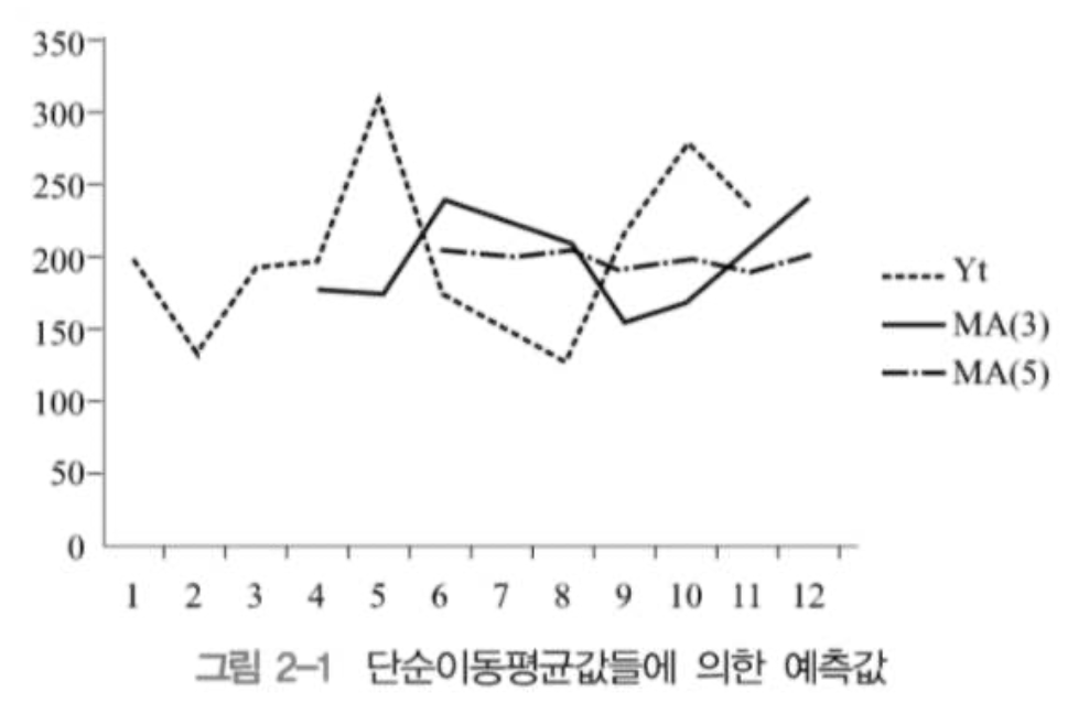1) 앞에 있는 방법들은 시계열자료가 어떤 추세를 보이고 있을 경우 적당한 예측방법이 될 수 없기 때문에 추세가 있는 경우 선형이동평균방법(linear moving average method)을 사용하는 것이 바람직하다.