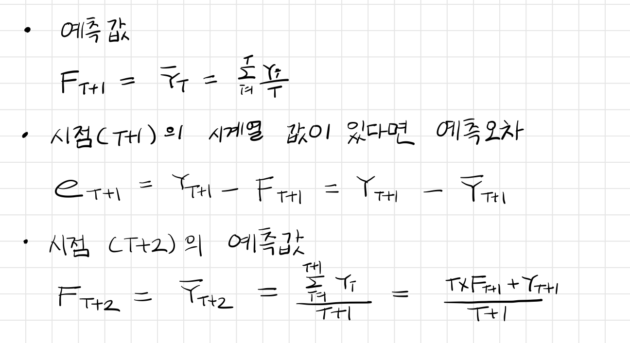 1) 시계열 자료, { Y(T) } 가 있을 때 예측시점(T)에서 차기시점(T+1)의 예측값, F(T+1)로 나타내고, 예측시점에서 가지고 있는 과거 자료들의 평균을 차기시점의 예측값으로 한다.