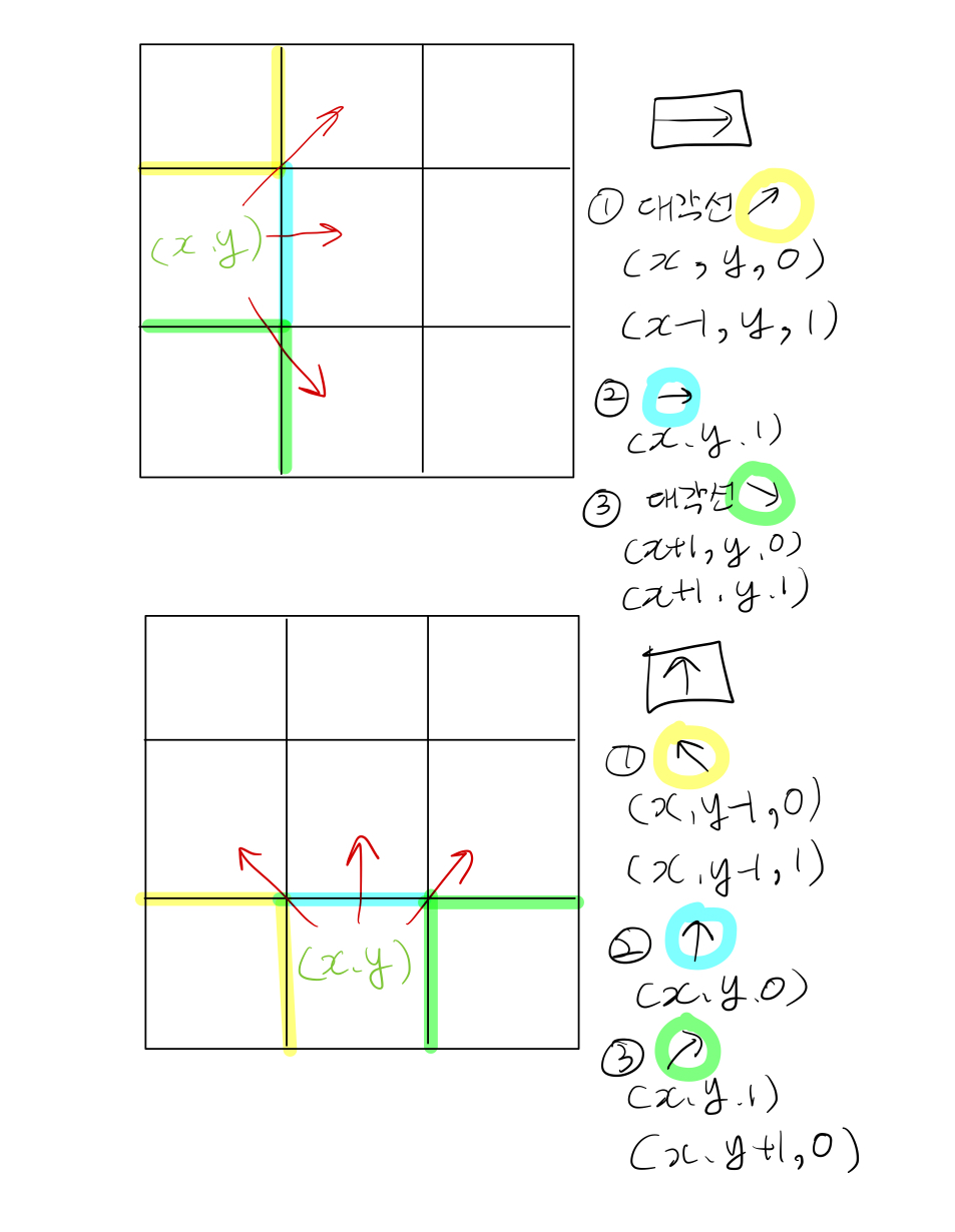 - 세상 빡구현이다... 처음에 동,서,북,남, 대각선들을 체크할 때 벽의 확인 부분이 일관된줄 알고 구현했는데 알고 보니 방향에 따라 이동 위치의 벽의 확인 위치도 다 달라져서... 그냥 맞춰서 다 구현할 수 밖에 없었다 ^_^..