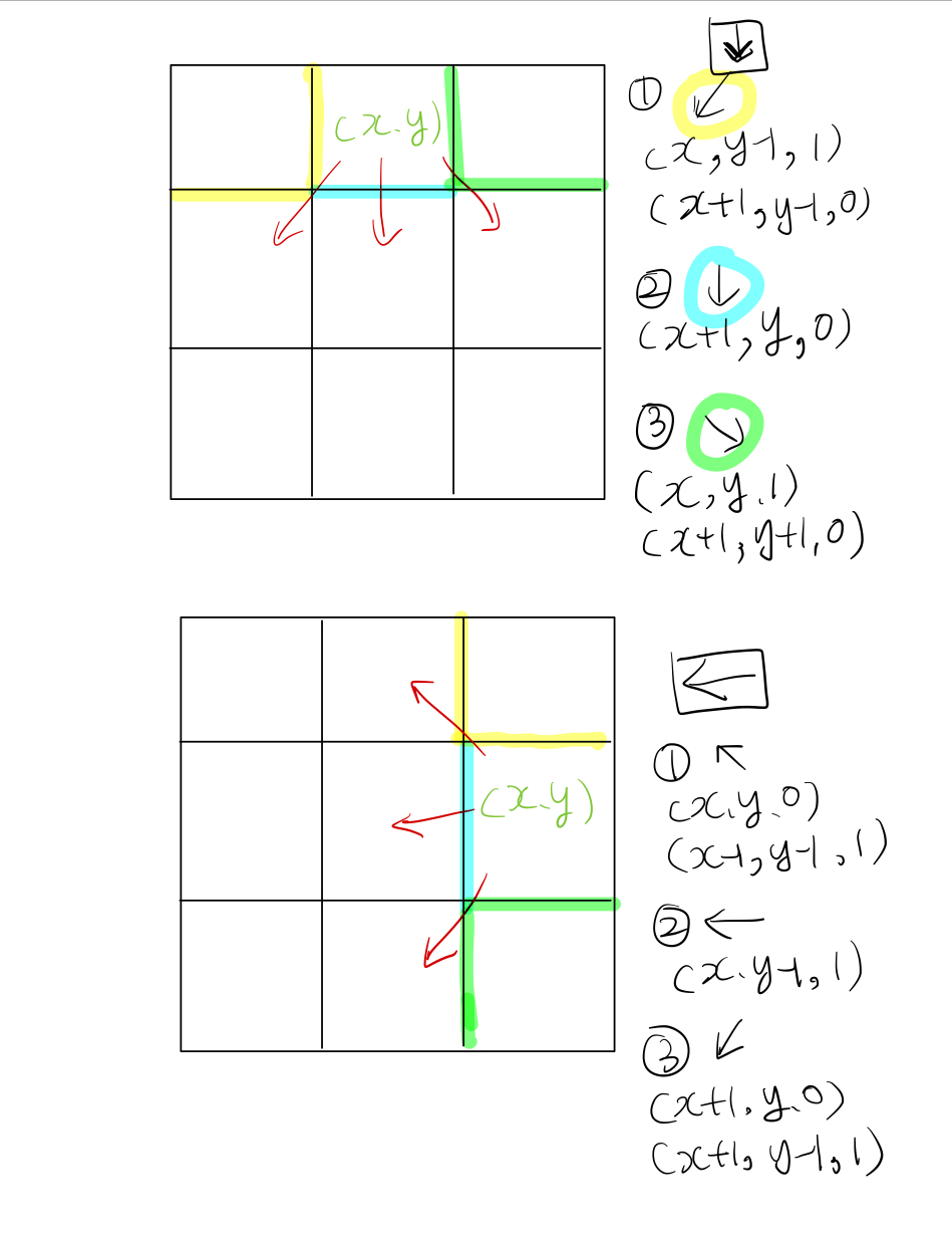 - 각 이동 방향에 맞춰 이동할 수 있는 부분이 빨간색이고 해당 곳에 이동을 하기 위해서는 위와 같이 현재 위치(x, y)에서 각 이동할 방향에 맞춰 벽이 존재하는지를 탐색해야한다. 이것을 check_wall이라는 3차원 배열을 통해 구현하였으며 각 방향(동, 서, 북, 남) 의 방향에 맞춰 벽이 있는지 확인할 수 있는 수치를 넣어 x, y로 nx, ny를 구해 범위를 넘지 않는 범위에서 벽이 존재하는지 체크하였다.