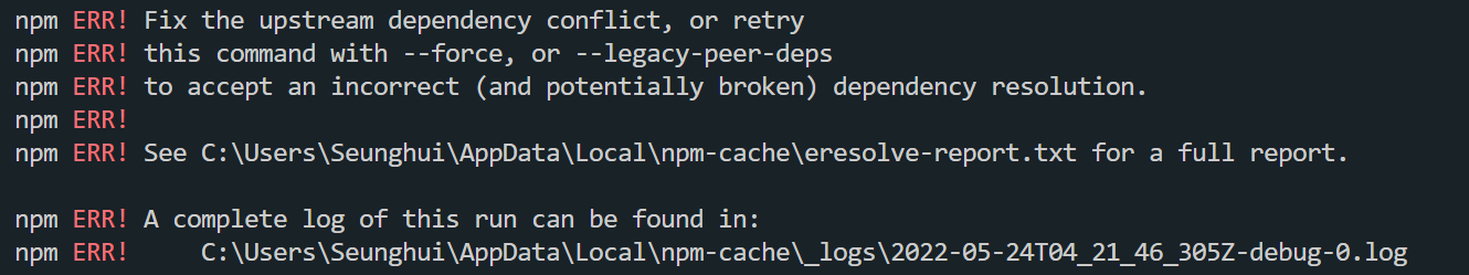 npm으로 설치 사이에 "--legacy-peer-deps"을 넣어주니 해결완료 !