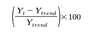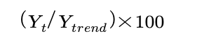 - 또한 순환변동지수를 아래식으로도 나타낼 수도 있는데, 이는 추세를 제거시킨 자료(=잔차), ( Y(t) - Y(trend) ) 를 추세값으로 나눈 것으로서 상대적 순환잔차 (relative cyclical residual)이라고 한다.