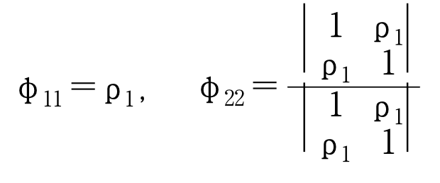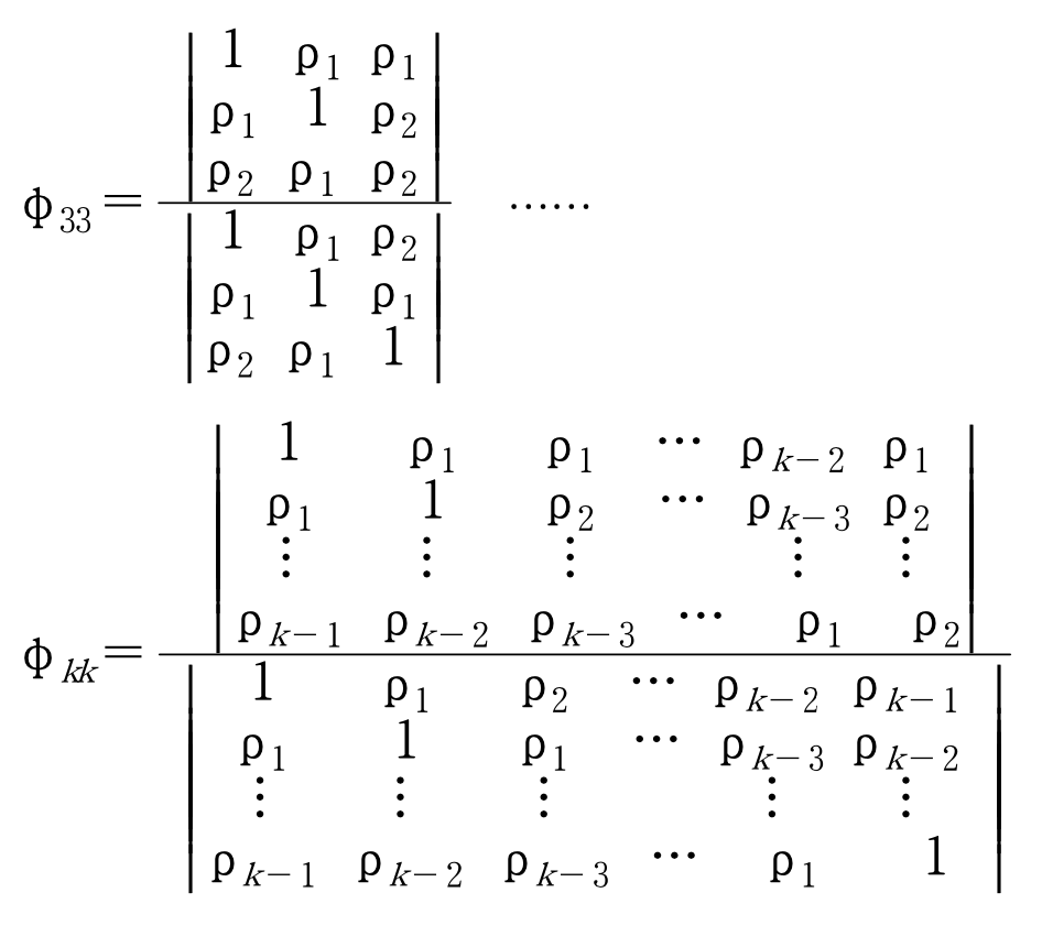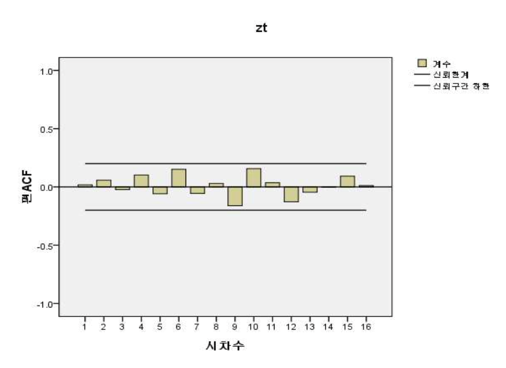 - 임의의 시차 k에 대하여 z(t)와 z(t-k)의 상관관계에서 그것들 사이에 끼어있는 z(t-1), z(t-2), ... , z(t-(k-1))의 상호선형의존성을 제거한 후의 z(t)와 z(t-k)만의 자기 상관함수를 편자기상관함수(partial autocorrelation function)이라 한다.