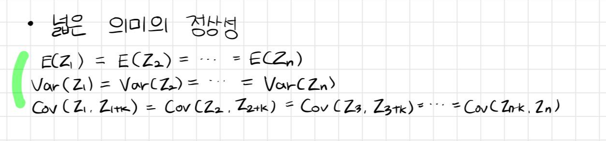 - 즉, 시계열의 평균과 분산이 시점 t에 관계없이 일정하고 공분산은 두 시점의 시차 k에만 영향을 받는다. 정상확률과정(stationary stochastic process)은 넓은의미의 정상을 갖는 확률과정이다.