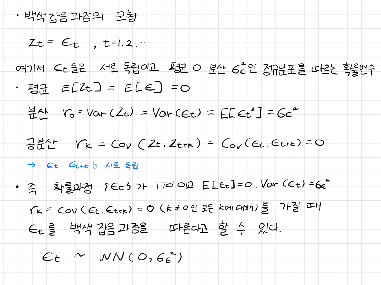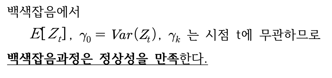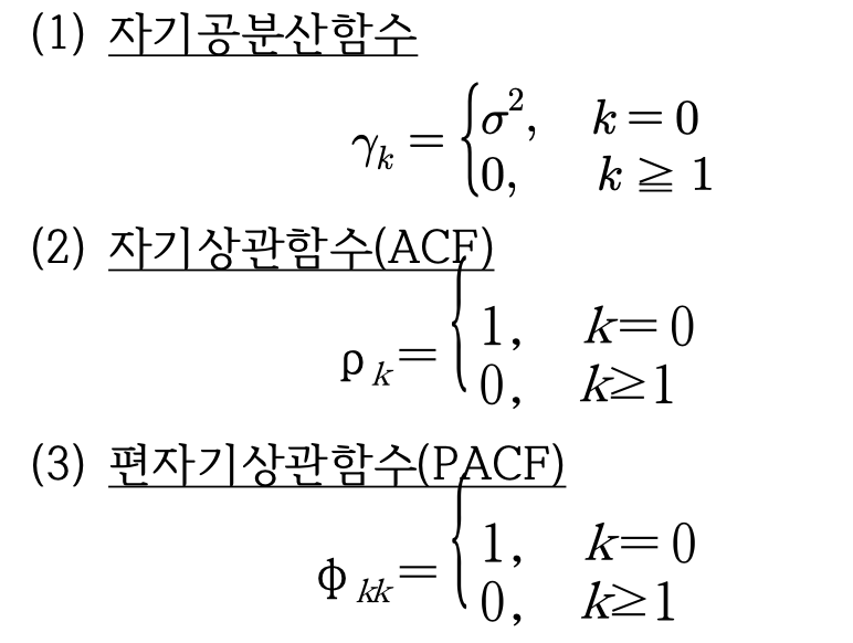 - 백색잡음과정은 시계열 모형의 수립에 매우 중요하며, 다음이 성립되야 한다.
