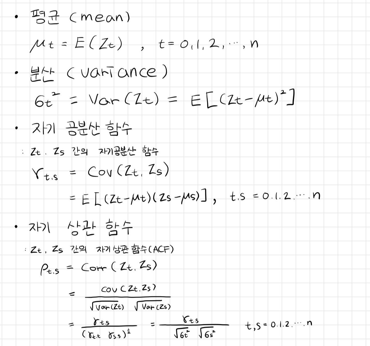 - 확률변수 Zt는 하나의 분포를 가지며 실현값 Zt는 Zt가 취할 수 있는 값 zt(1), zt(2), ..., zt(n)들 중 하나이고 두 시점 t 와 s 에서의 확률변수 Zt와 Zs는 서로 종속이다.