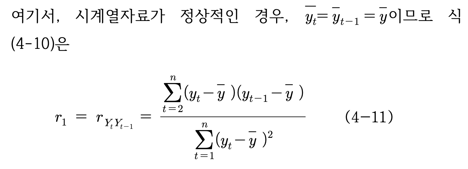 - 시차 1의 자기상관계수는 다음식,