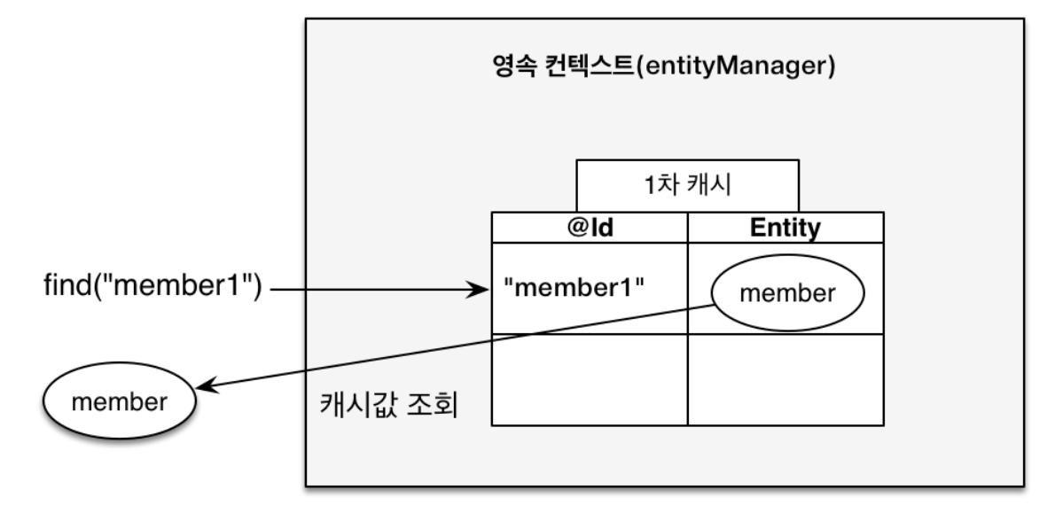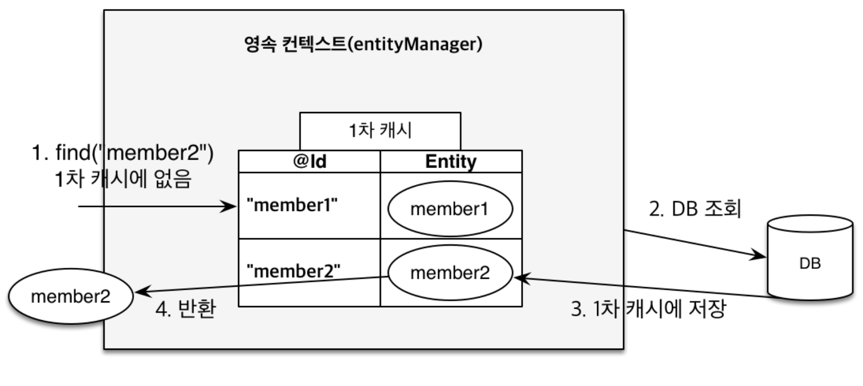 - DB에 접근하기 전에 영속성 컨텍스트에 찾는 대상이 존재하면 DB에서 Select 하지 않고 캐시에 저장된 값을 반환한다.