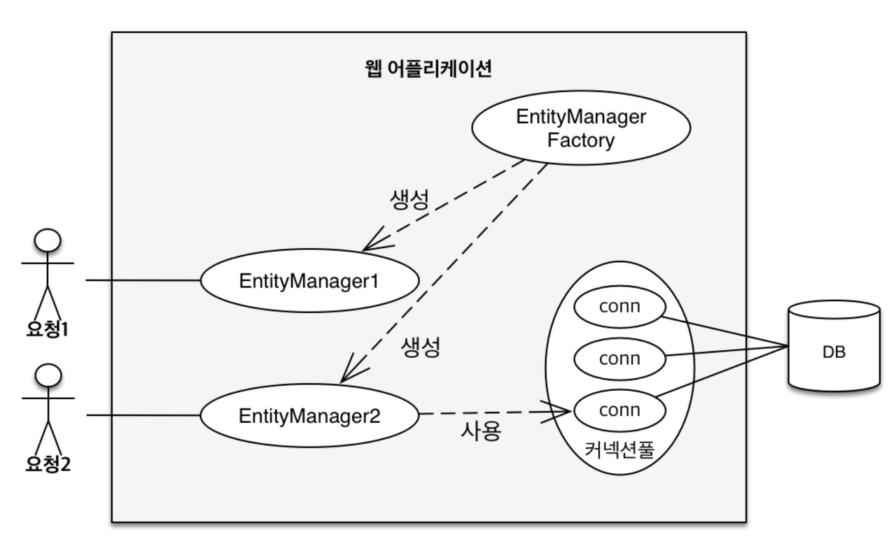- J2EE : 스프링과 같은 컨테이너 환경에서 EntityManager(N) : PersistenceContext(1)로 관리된다.