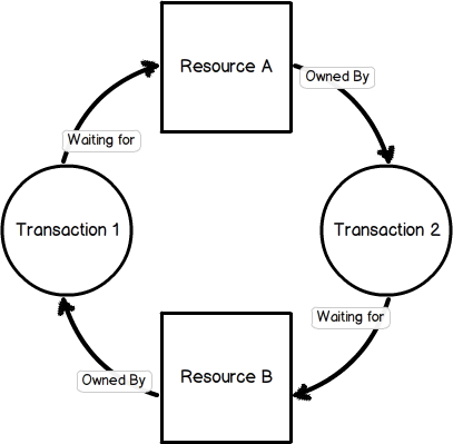 - 교착상태란 두 개의 트랜잭션이 각각 하나의 리소스에 Lock을 건 상태로 서로의 리소스에 접근하여 값을 얻어오려고 할 때 각각의 Lock에 의해 양쪽 트랜잭션이 아무것도 못하고 모두 영원히 처리가 되지 않는 상태를 말한다.