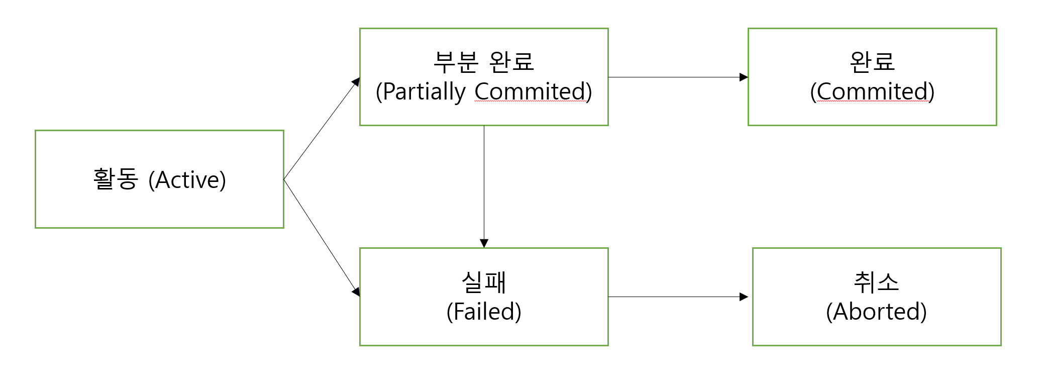 - 실패 (Failed) : 트랜잭션이 실패한 상태이다. 트랜잭션이 더이상 정상적으로 동작할 수 없는 상태를 말한다.