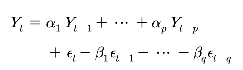 시계열자료가 과거의 시계열자료 값들과 과거의 오차값들 모두의 영향을 받을 때 AR과 MA가 혼합된 자기회귀이동평균모형(Autocorrelation Moving Average Model)을 다음과 같이 나타낸다.