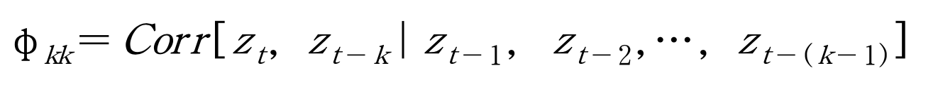 - 즉, 임의의 시차 k에 대하여 z(t)와 z(t-k)의 상관관계에서 그것들 사이에 끼어있는 z(t-1), z(t-2), ..., z(t-k)의 상호선형의존성을 제거한 후의 z(t)와 z(t-k)만의 자기상관함수를 편자기 상관함수(partial autocorrelation function)이라 한다.
