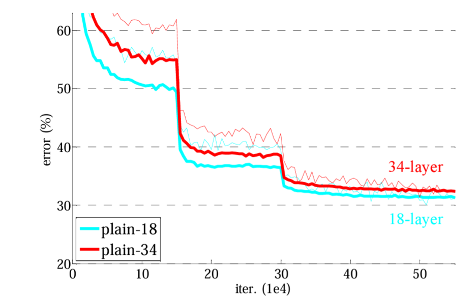 18-layer가 34-layer의 더 깊은 모델이 높은 validation error가 발생함
