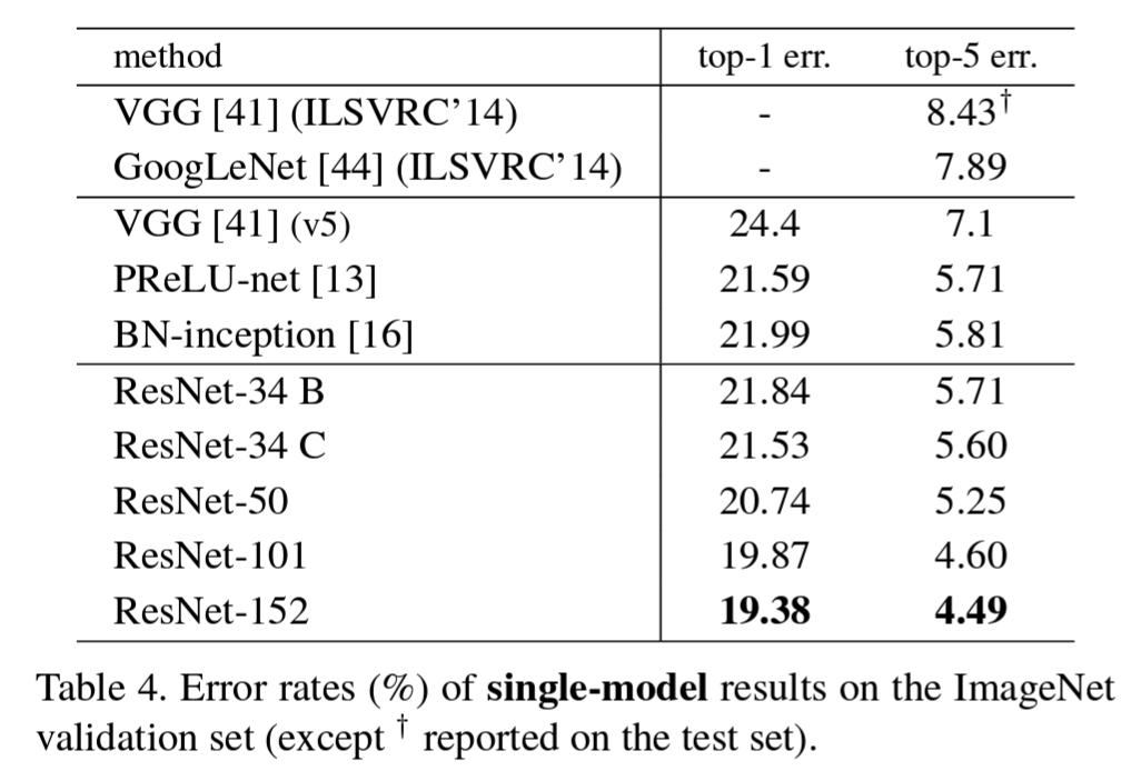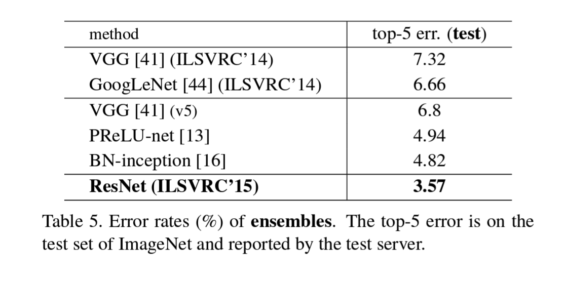 ResNet의 single모델은 이전의 다른 모델의 성능을 능가함, top-5-error를 3.57%를 달성함