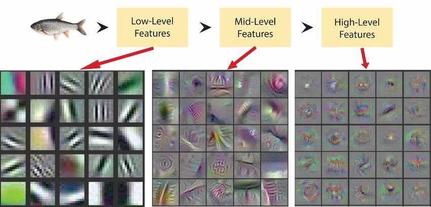 low-level에서 high-level로 갈 수록, 기본적인(엣지, 텍스처)와 같은 특징에서 더 추상적이고 복잡한 특징들이 확인 가능함 → layer가 더 추가될수록 이런 특징들이 자연스럽게 통합됨