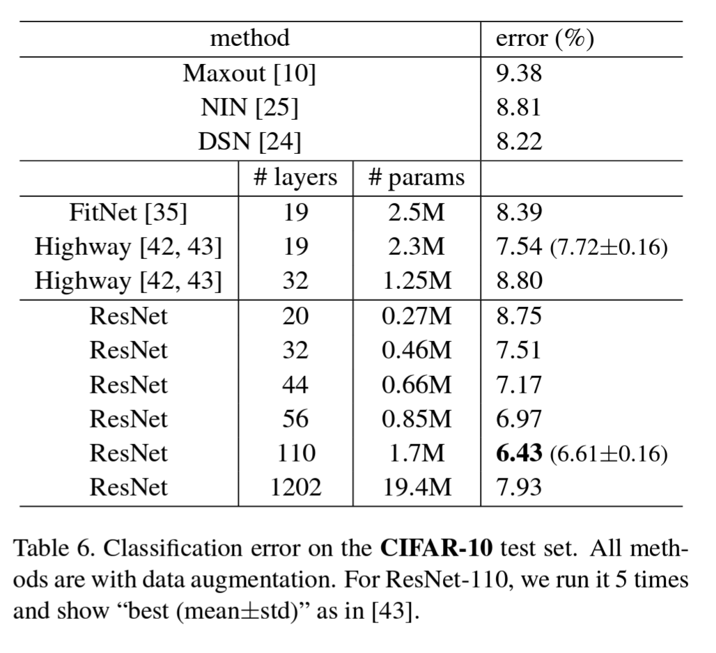 1000개 이상의 layer가 사용된 ResNet 모델은 110-layer ResNet보델과 training error가 같았지만, test 결과는 좋지못함
