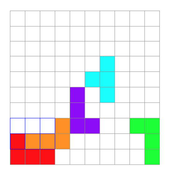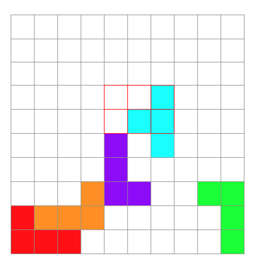 [[0,0,0,0,0,0,0,0,0,0],[0,0,0,0,0,0,0,0,0,0],[0,0,0,0,0,0,0,0,0,0],[0,0,0,0,0,0,0,0,0,0],[0,0,0,0,0,0,4,0,0,0],[0,0,0,0,0,4,4,0,0,0],[0,0,0,0,3,0,4,0,0,0],[0,0,0,2,3,0,0,0,5,5],[1,2,2,2,3,3,0,0,0,5],[1,1,1,0,0,0,0,0,0,5]] 2