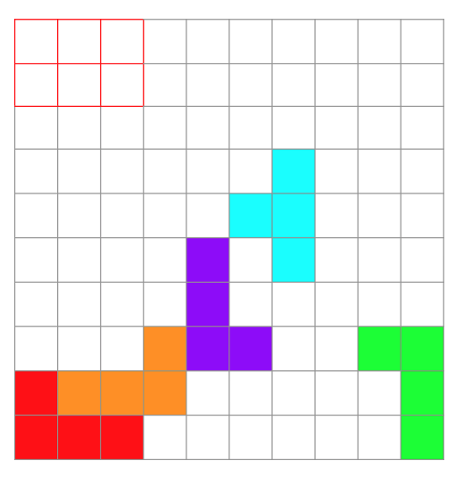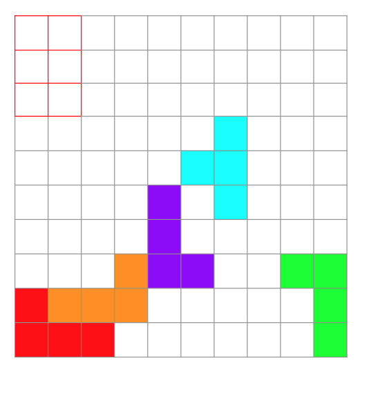 예를 들어, 다음과 같은 2x3 구간을 보는데 3칸을 채울 수 있다면 이 부분은 해당 블록이 모두 존재하는 부분이 아니기 때문에 해당 부분의 블록을 지울 수 없다고 False를 반환하는 것이다.