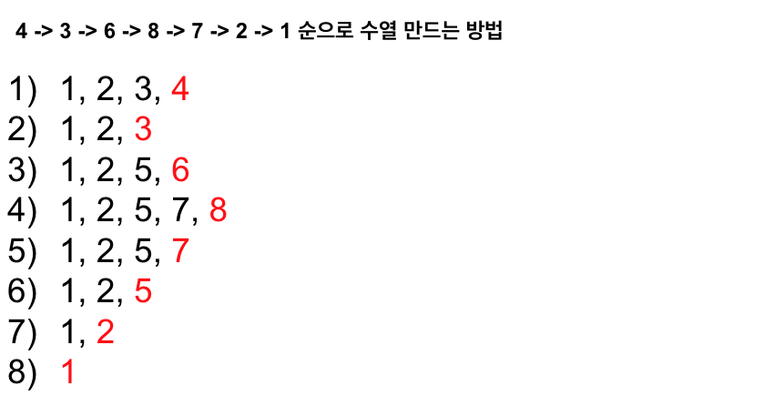 1부터 n까지에 수에 대해 차례로 [push, push, push, push, pop, pop, push, push, pop, push, push, pop, pop, pop, pop, pop] 연산을 수행하면 수열 [4, 3, 6, 8, 7, 5, 2, 1]을 얻을 수 있다.