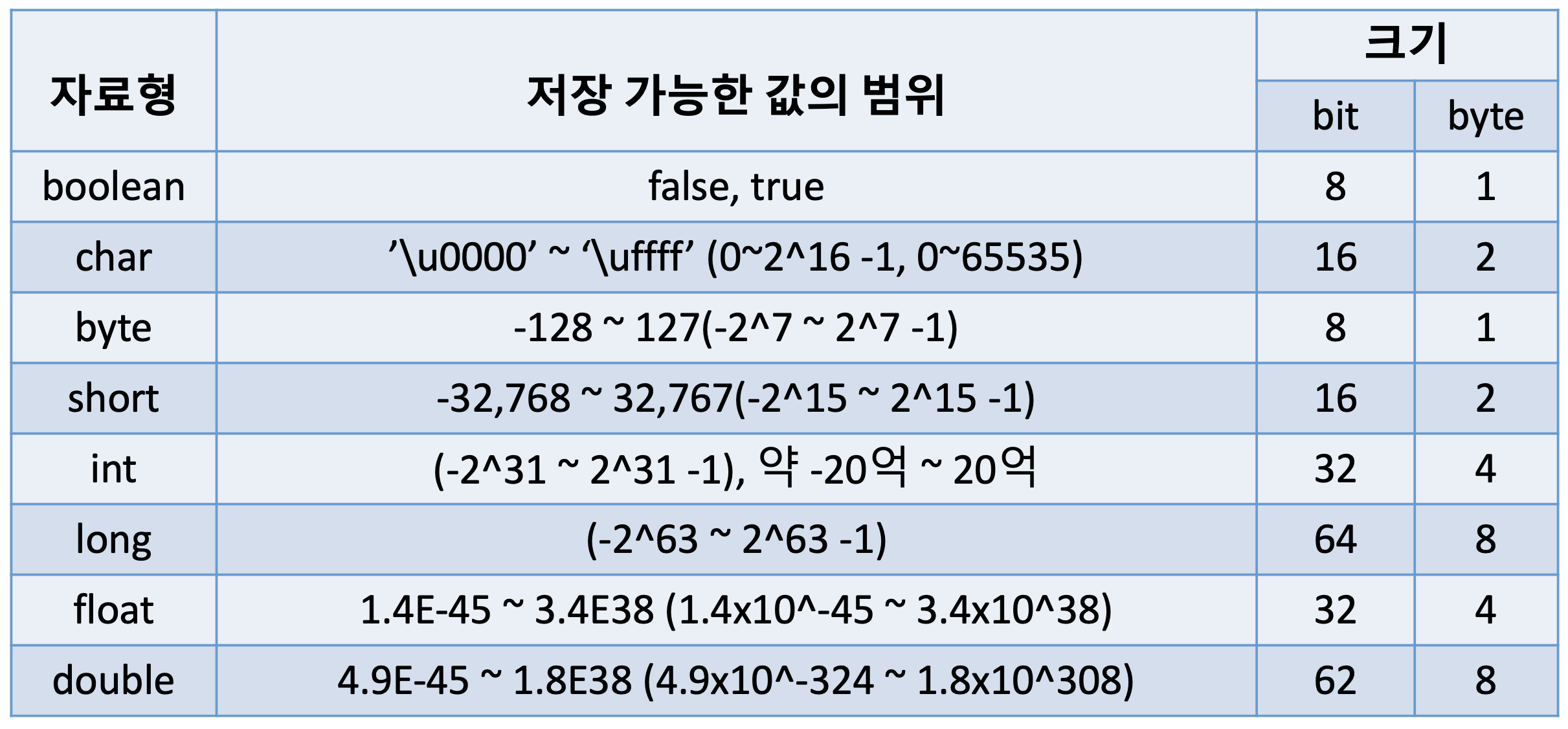 - 정수형(byte, short, int, long) : 정수를 저장하는데 사용되며, 주로 int가 사용된다. byte는 이진 데이터를 다룰 때 사용, short는 C언 어와의 호환을 위해서 사용