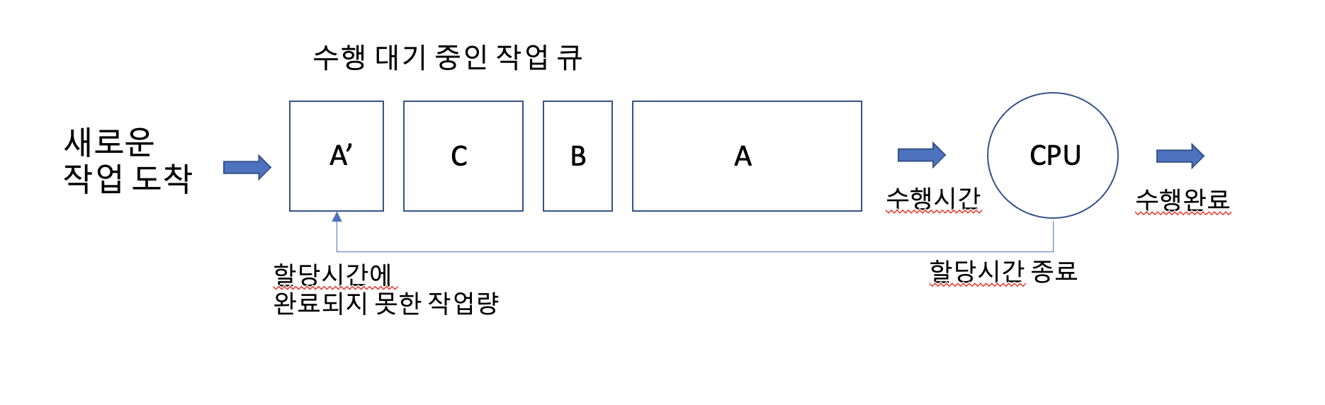 - CPU를 한 번 할당받아 사용할 수 있는 시간을 일정하게 고정된 시간으로 제한하는 기법이다. 따라서 긴 작업을 요하는 프로세스가 CPU를 할당 받더라도 정해진 시간이 지나면 CPU를 내어놓고 CPU 대기열의 제일 뒤에 가서 줄을 서야 한다.