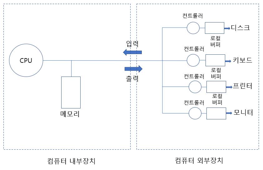 - 각 장치마다 이를 제어하기 위해 설치된 장치 컨트롤러는 장치로부터 들어오고 나가는 데이터를 임시로 저장하기 위한 작은 메모리를 가지고 있으며 이를 로컬 버퍼라고 한다.
