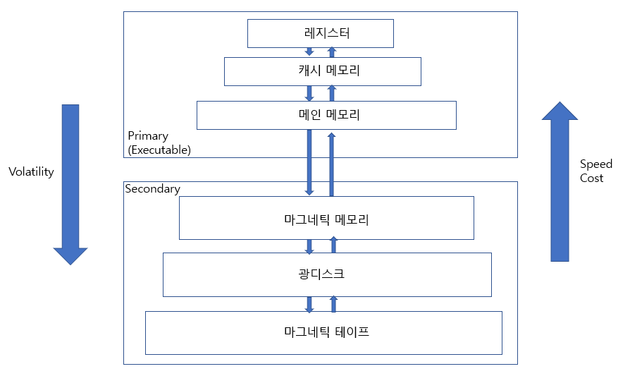 - 빠른 저장장치는 단위 공간당 가격이 높기 때문에 적은 용량을 사용하며, 느린 저장장치는 가격이 저렴해 대용량을 사용하는 반면 접근 속도가 느리다.
