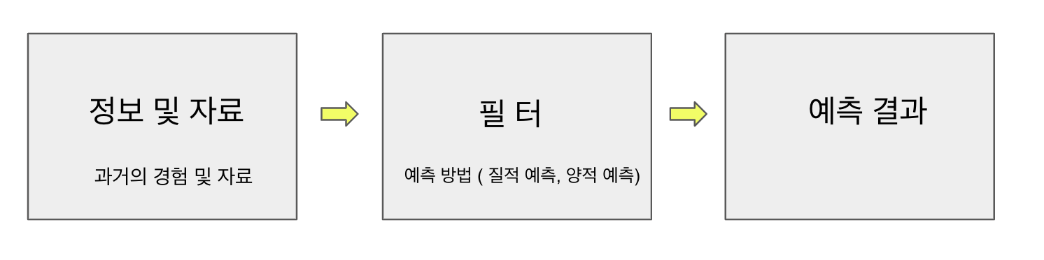 - 여기서 바람직한 예측이란 예측의 신뢰성을 높이기 위해서 예측에 도움이 되는 많은 과거의 경험 및 자료를 이용하여 체계적인 방법으로 규칙적인 패턴을 찾고 분석자의 신념을 더하고 예측을 수행하는 것