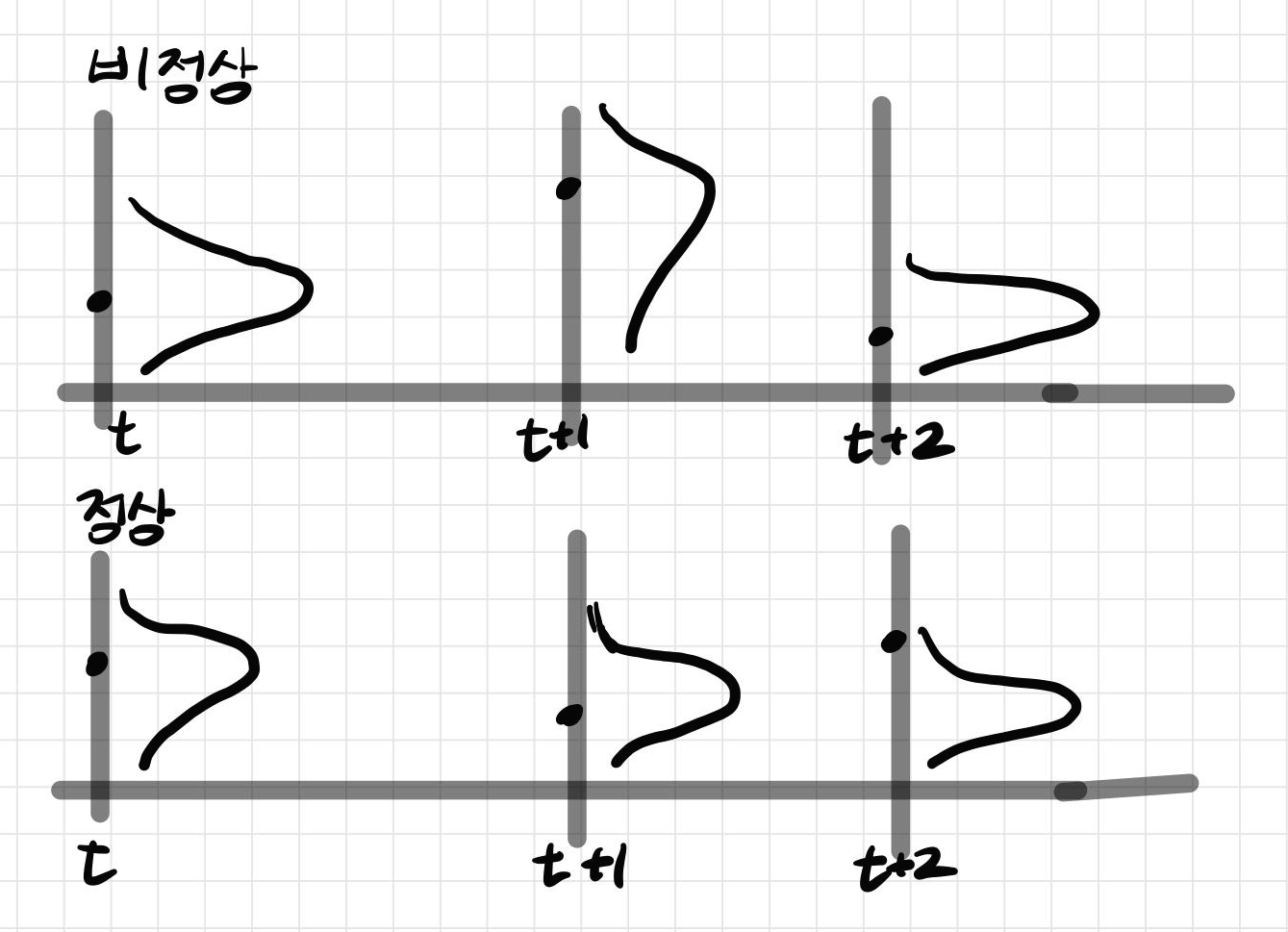 => 정상인 경우 모든 시점에 대해 데이터의 분포가 평균과 분산이 동일한 그림이다.. ( ㅎㅎ),,,