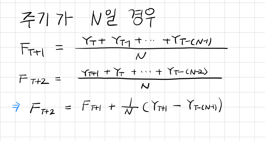 10) 시점 (T+2)의 예측값은 F(T+1)을 (Y(T+1) - Y(Y-(N-1))) / N만큼 조정한 것이라는 의미이고, 즉 N이 상당히 크다면 F(T+2)는 F(T+1)과 큰 차이를 보이지 않을 것이다.