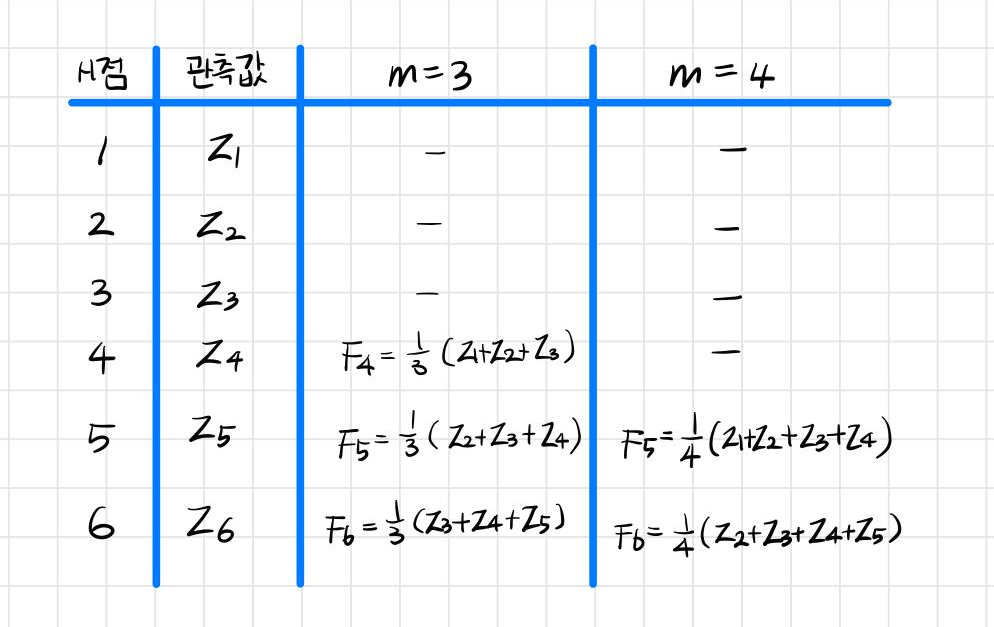 3) 예측시점을 기준으로 과거 일정한 개수의 자료들 평균을 다음 시점의 예측값으로 사용하는 방법이다.