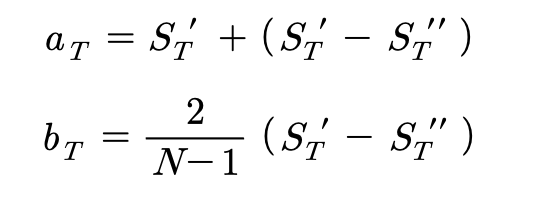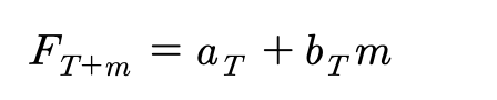 다음과 같이 할 때, 선형이동평균방법으로 시점 T에서 시점 (T+m)의 예측값은 다음과 같다.