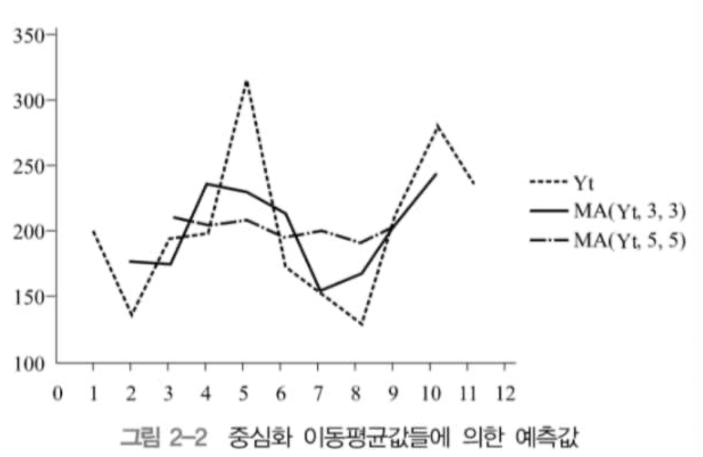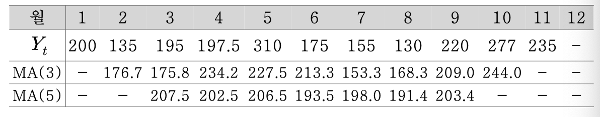 1) 단순이동평균방법에서는 주기가 3인 이동평균을 계산할 때, 시점 1-2-3의 이동평균값이 시점 4의 예측값이 되지만 계절적인 변동이 있을 경우 시점 1-2-3의 이동평균은 계절변동을 상쇄한 것이므로 이동평균값의 위치를 시점 1-2-3의 중심인 시점 2에 위치시는 것이 바람직한데 이를 중심화 이동평균방법이라고 한다.