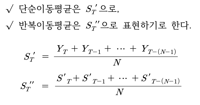 - MA(4)는 분기별 자료에 대해 사용할 수 있는데, 4개의 자료들 평균을 얻으면 분기마다 가지고 있는 계절효과가 제거됨
