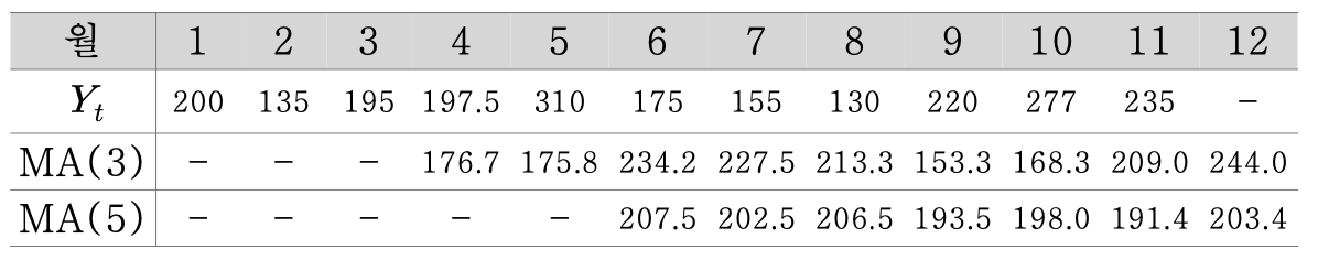 3) 선형이동평균방법에 의한 예측방법을 일반화시키면 다음과 같다.