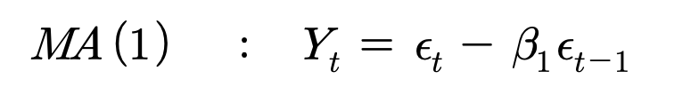 바로 이전 시점 (t-1)의 오차항만이 포함되는 경우라면 1차 이동펴균이 되며 식은 다음과 같다.