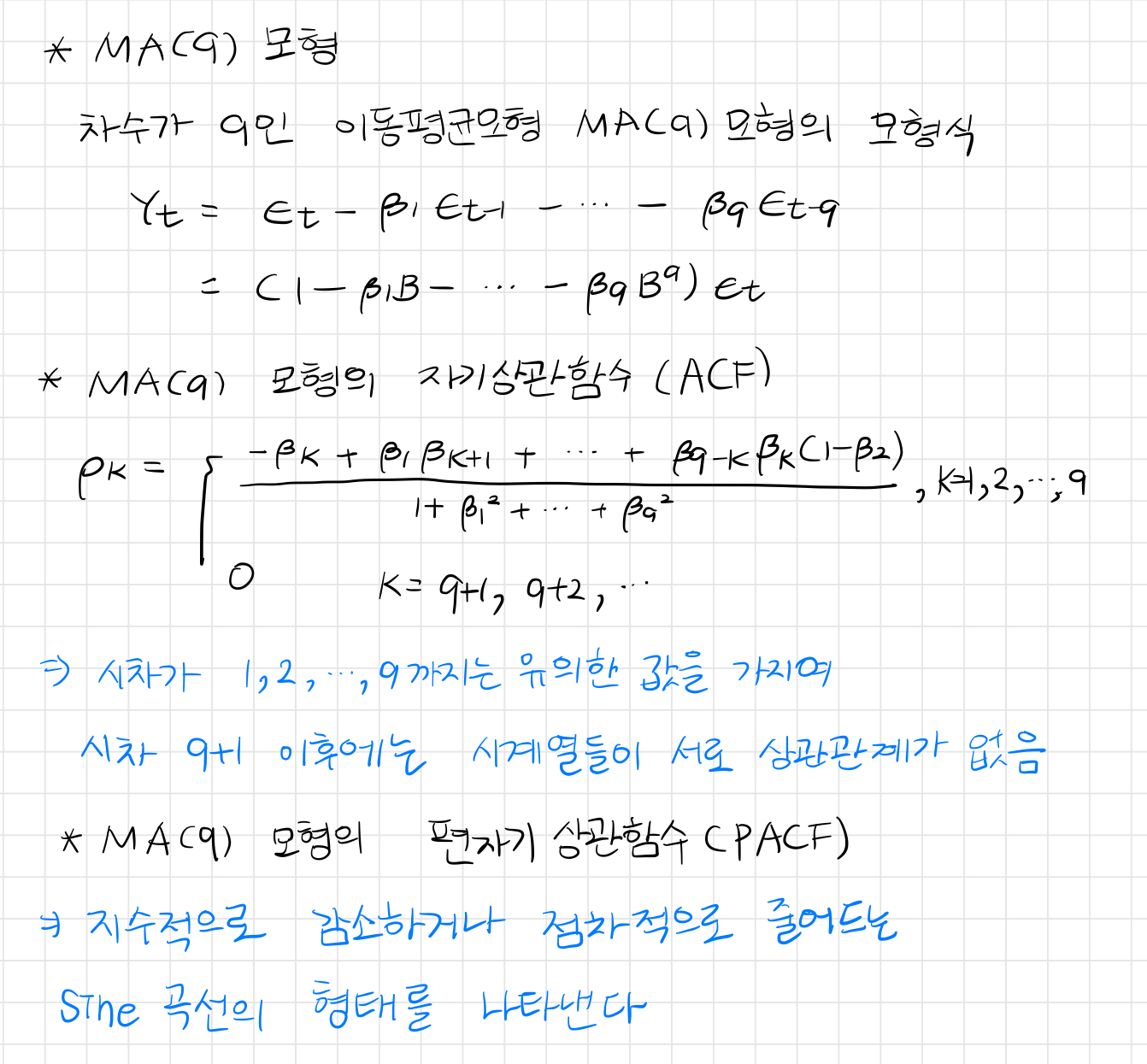 - MA(q): 자기상관함수는 시차가 q이후에 0으로 절단된 형태