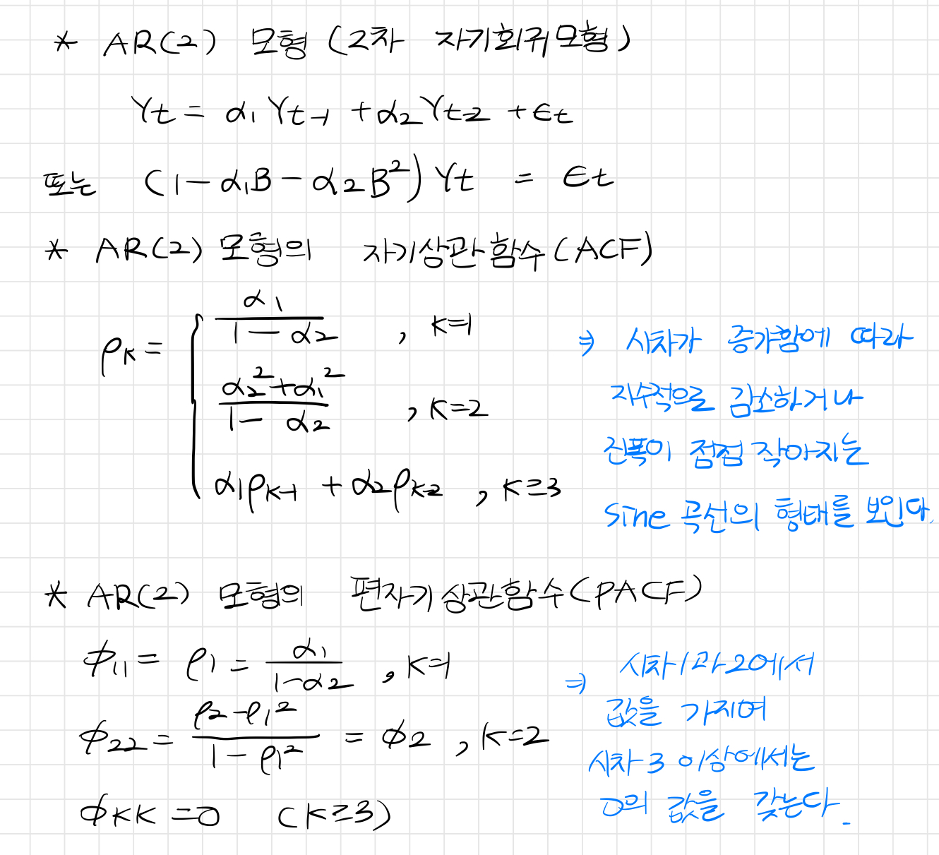 - AR(p)모형의 자기상관함수(ACF)는 시차가 커짐에 따라 지수적으로 감소하거나 또는 진폭이 점점 작아지는 sine곡선의 형태를 그리며 감소한다.